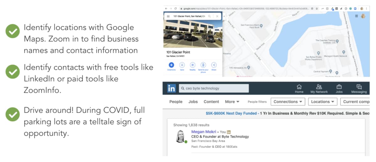 In a larger company, decisions around food or vending will most often fall within facilities or wellness, if that role exists. In smaller companies, try targeting the office manager, HR, or even the CEO. The goal of prospecting is to get the direct contact information associated with the spots you’re interested in. There are many tools that can be used to do this, and, yes, it’s very possible to prospect without spending a dime!
